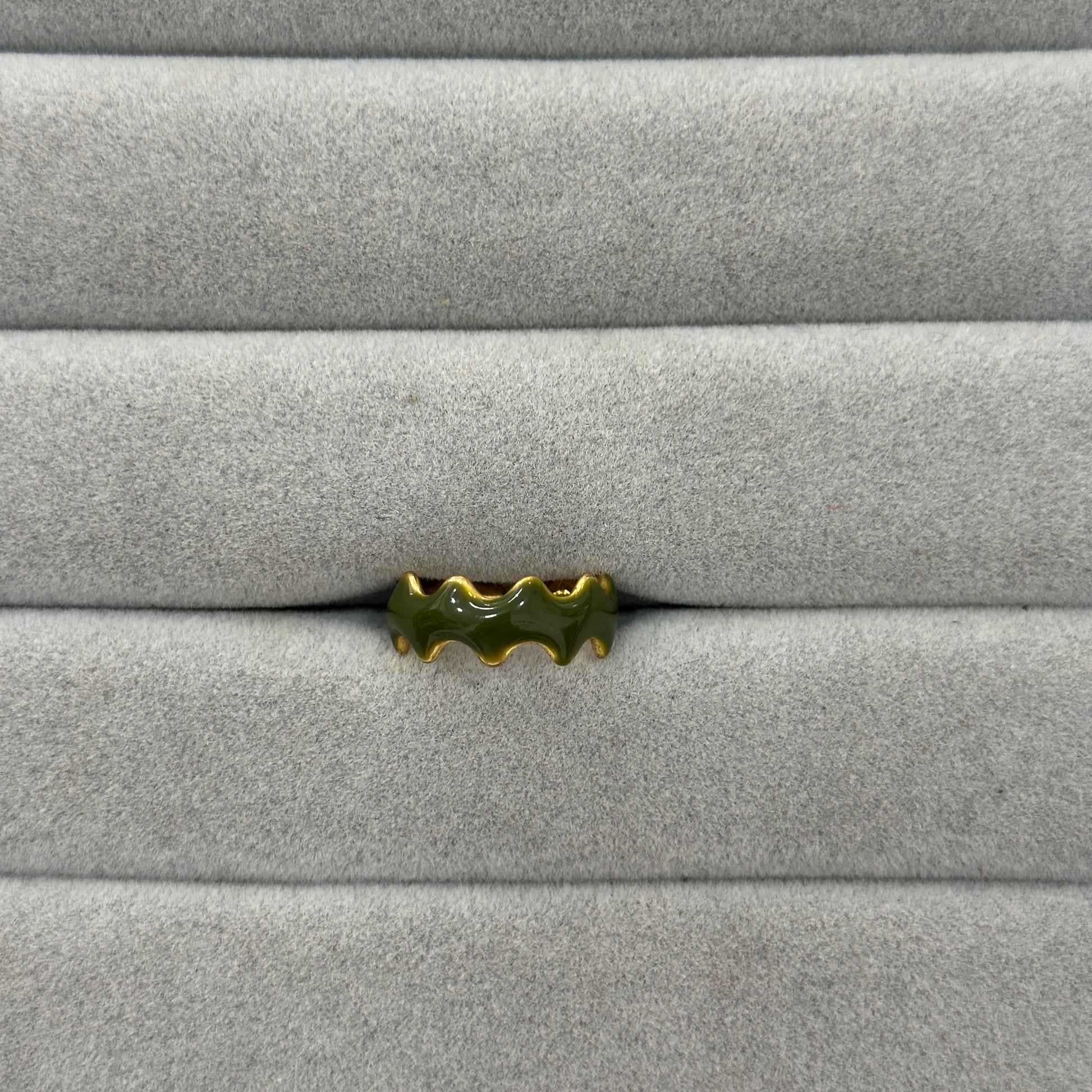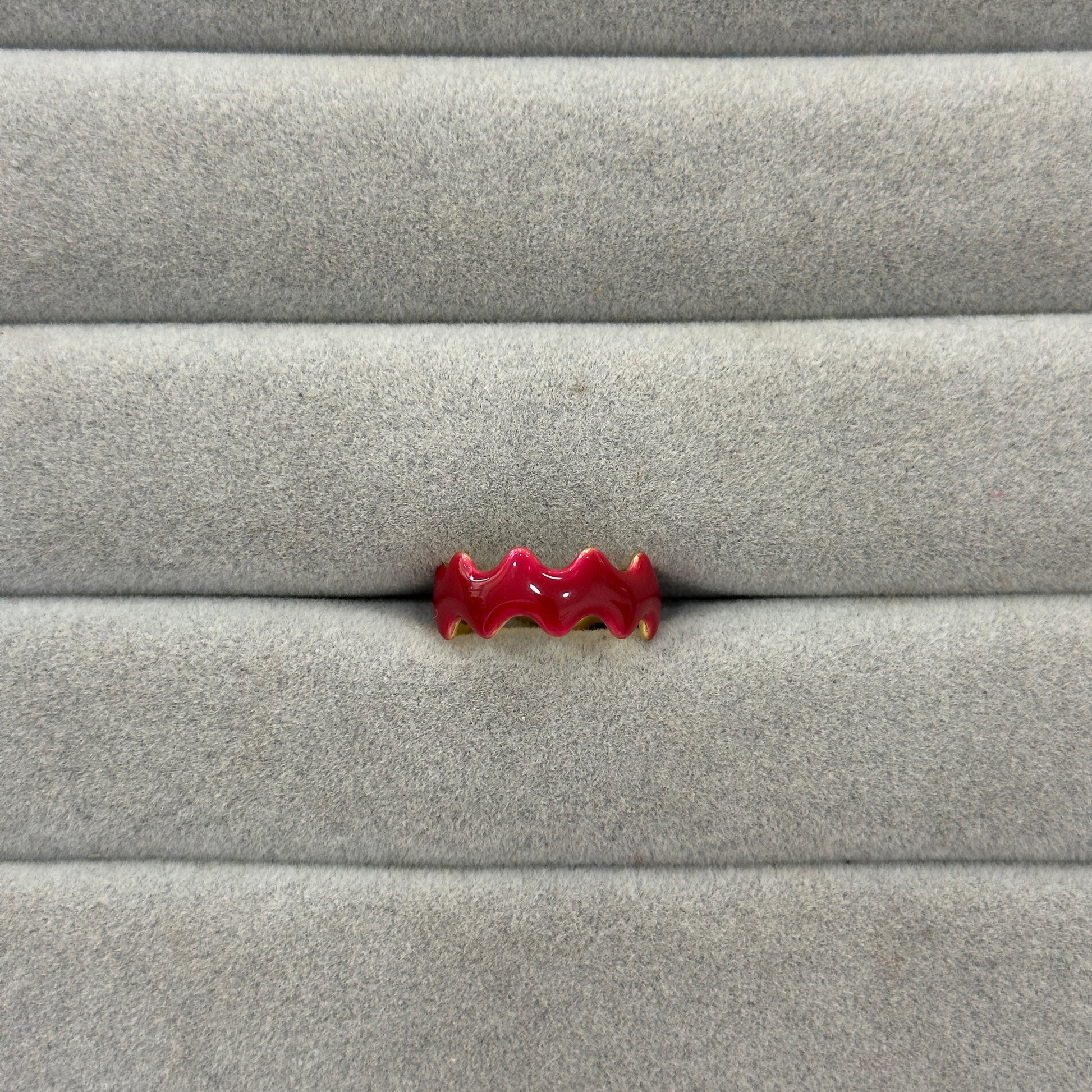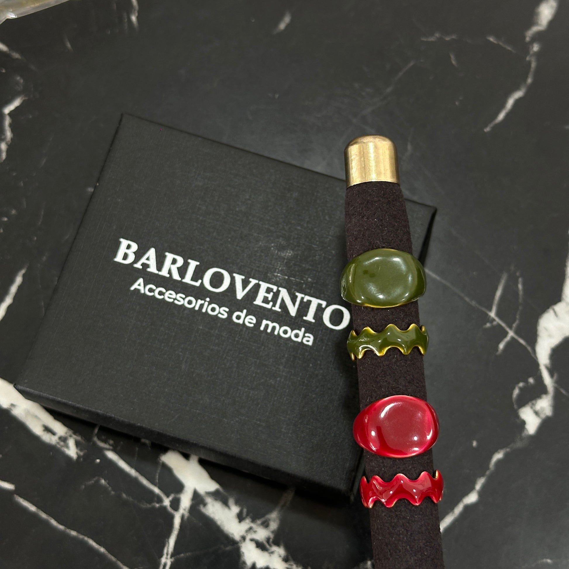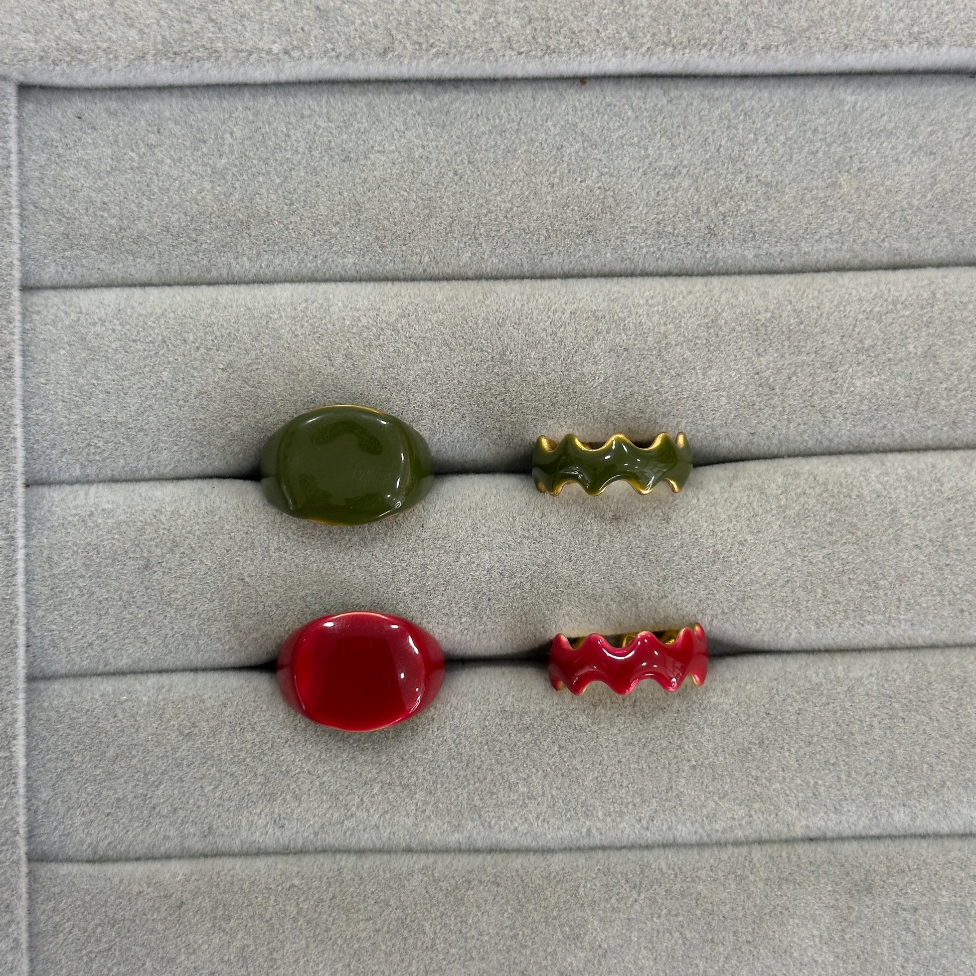 Cuatro diseños únicos en verde y rojo: dos con acabado liso tipo piedra y dos con forma ondulada. Colores vibrantes para combinar, contrastar y darle un toque original a cualquier look.