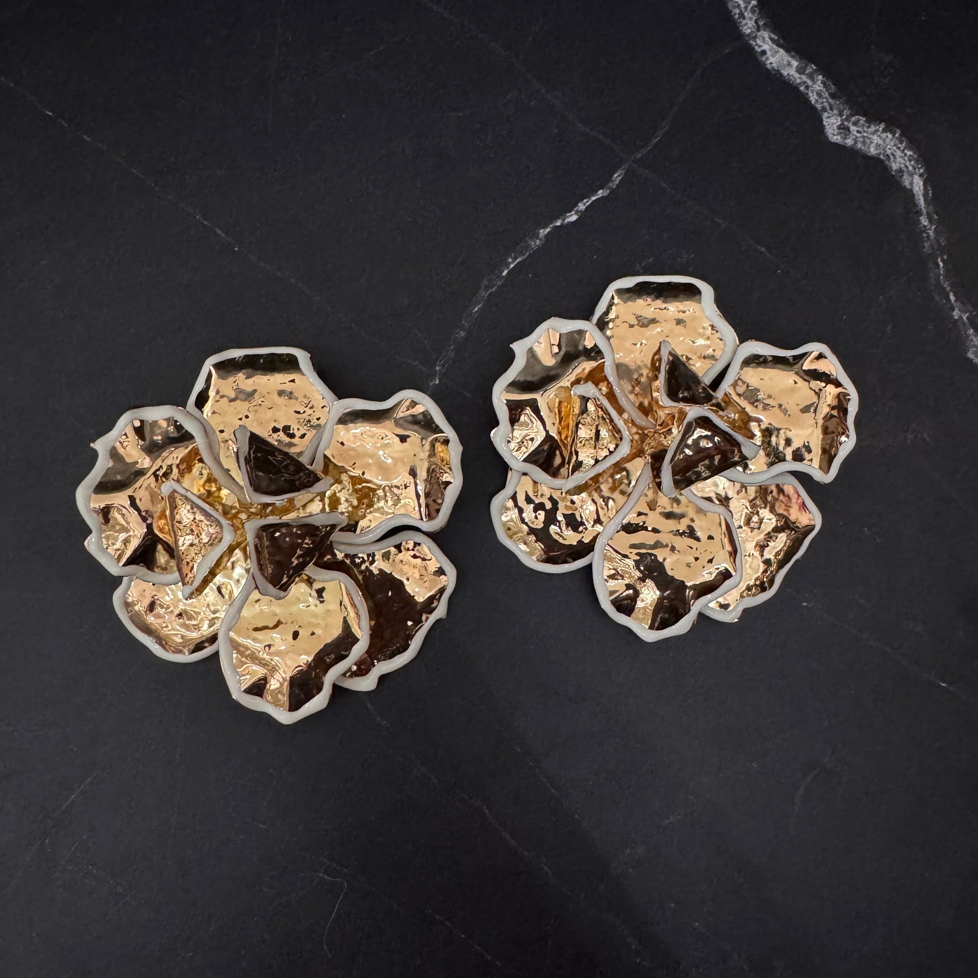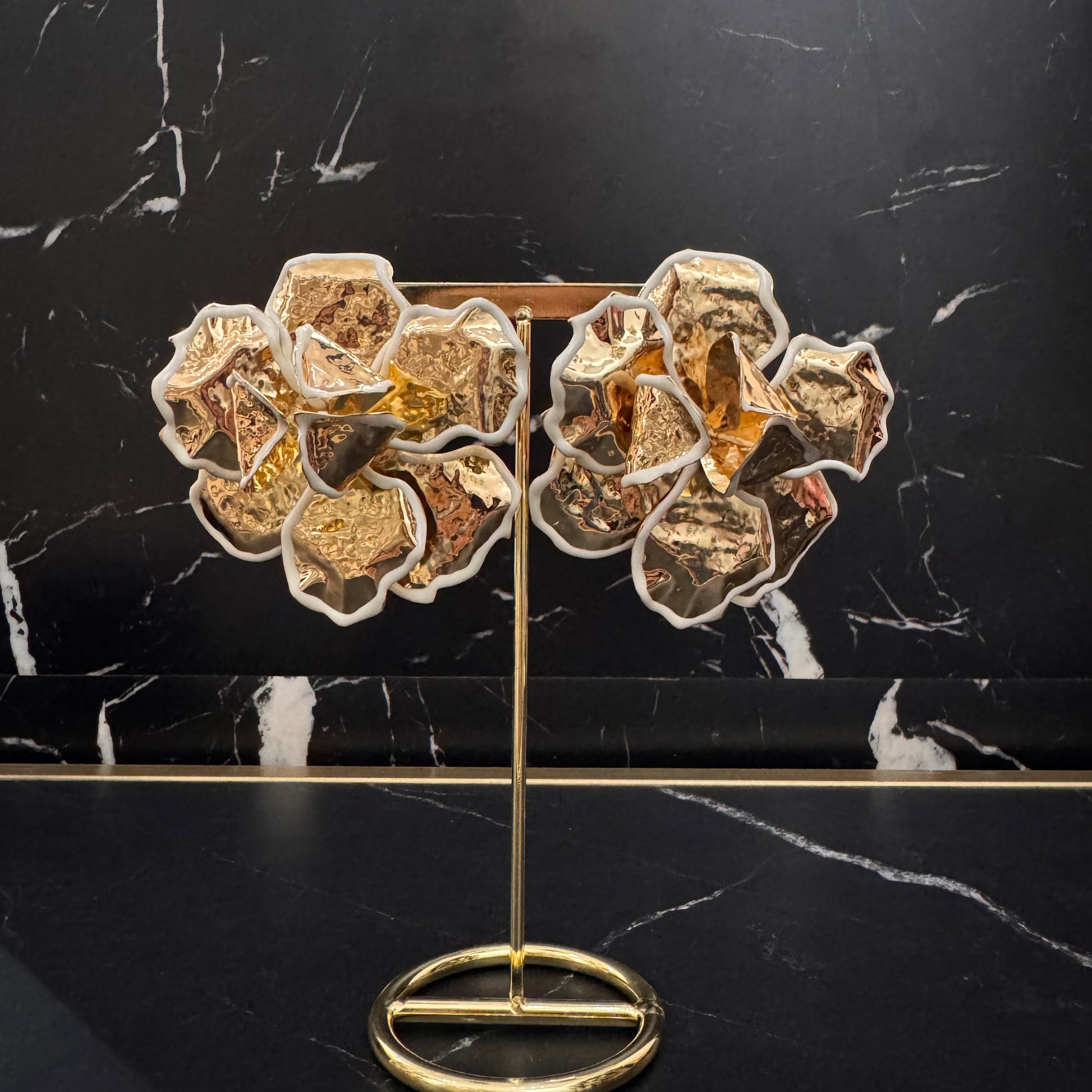 Aretes en tamaño grande y diseño floral, en tono dorado con borde blanco