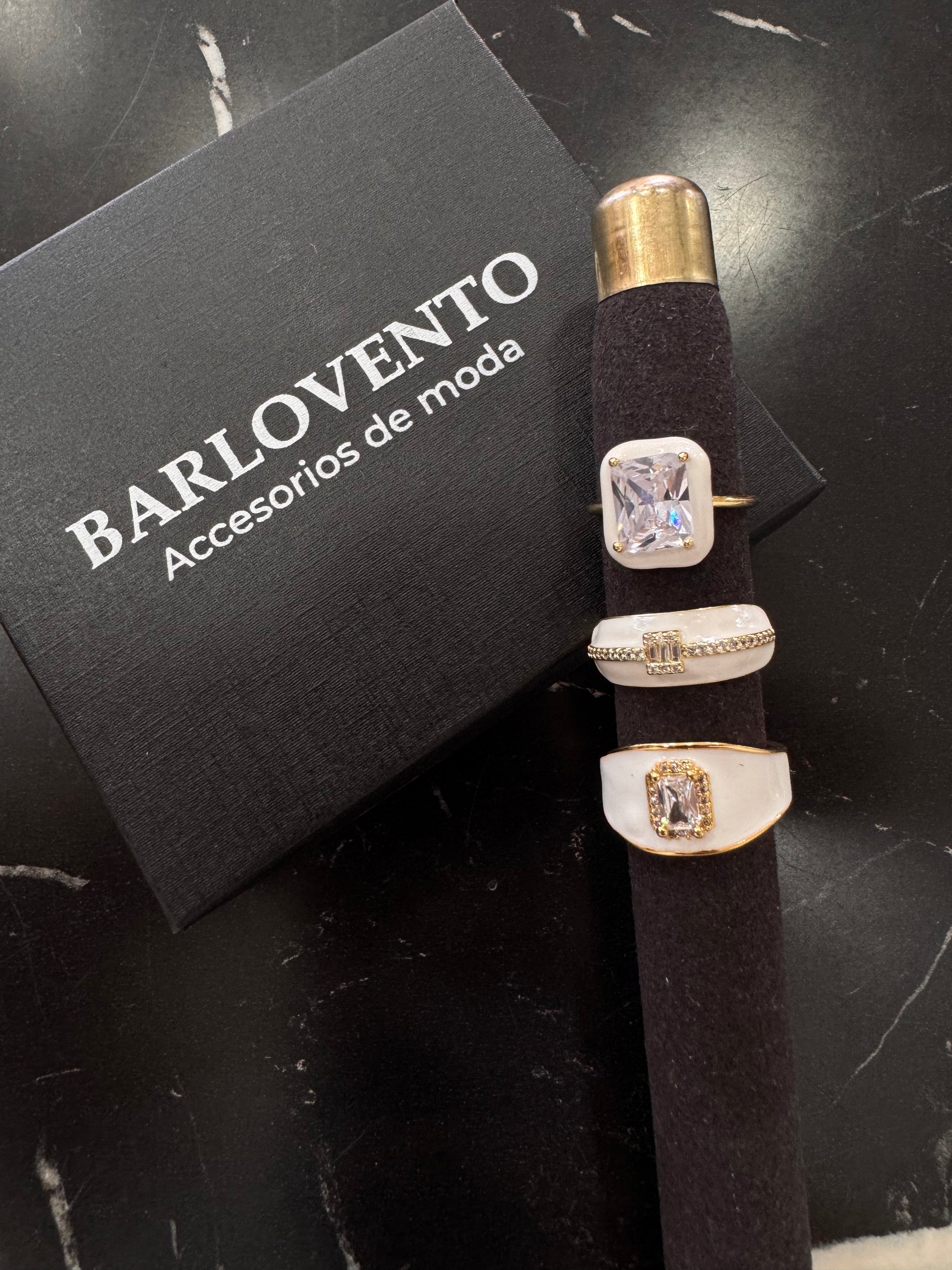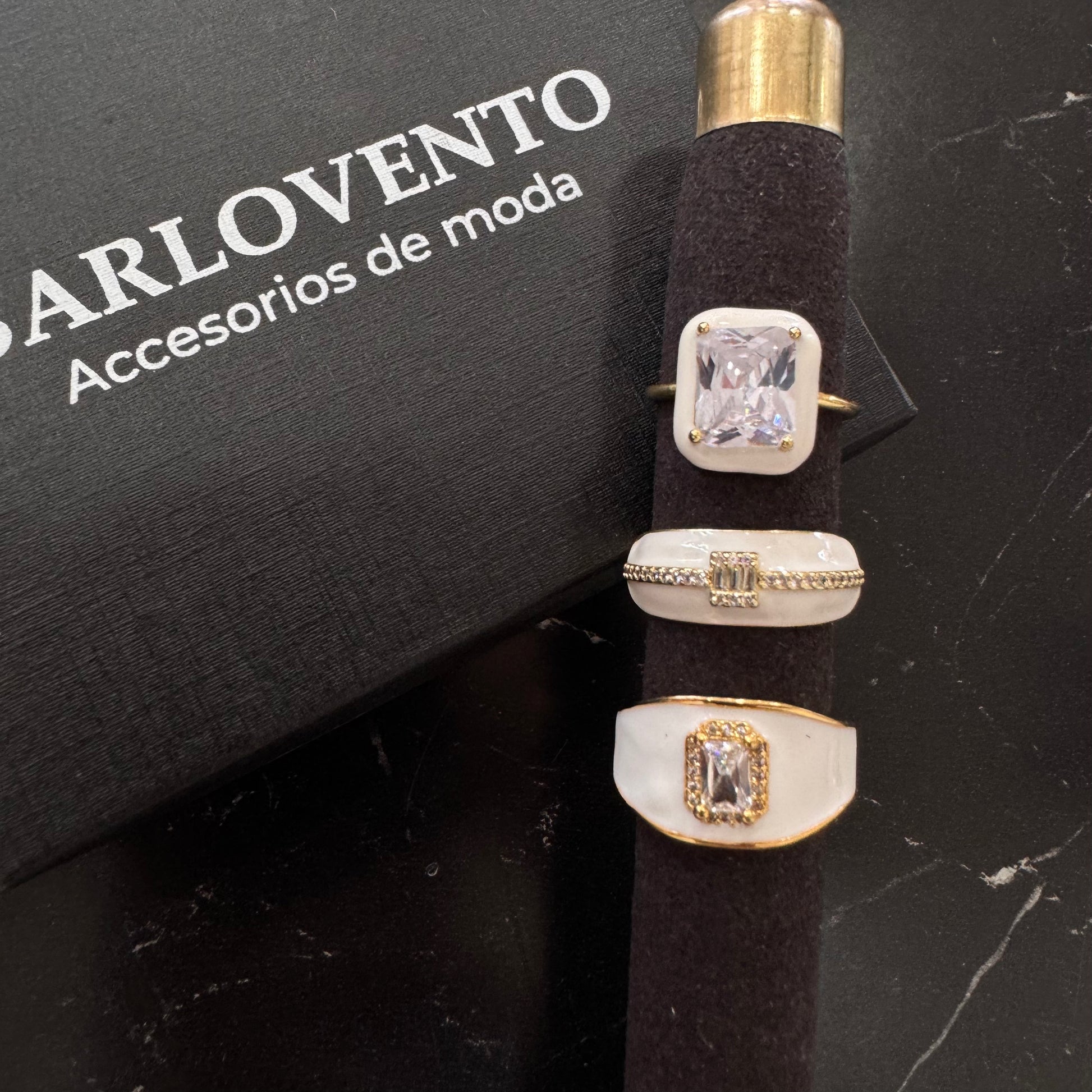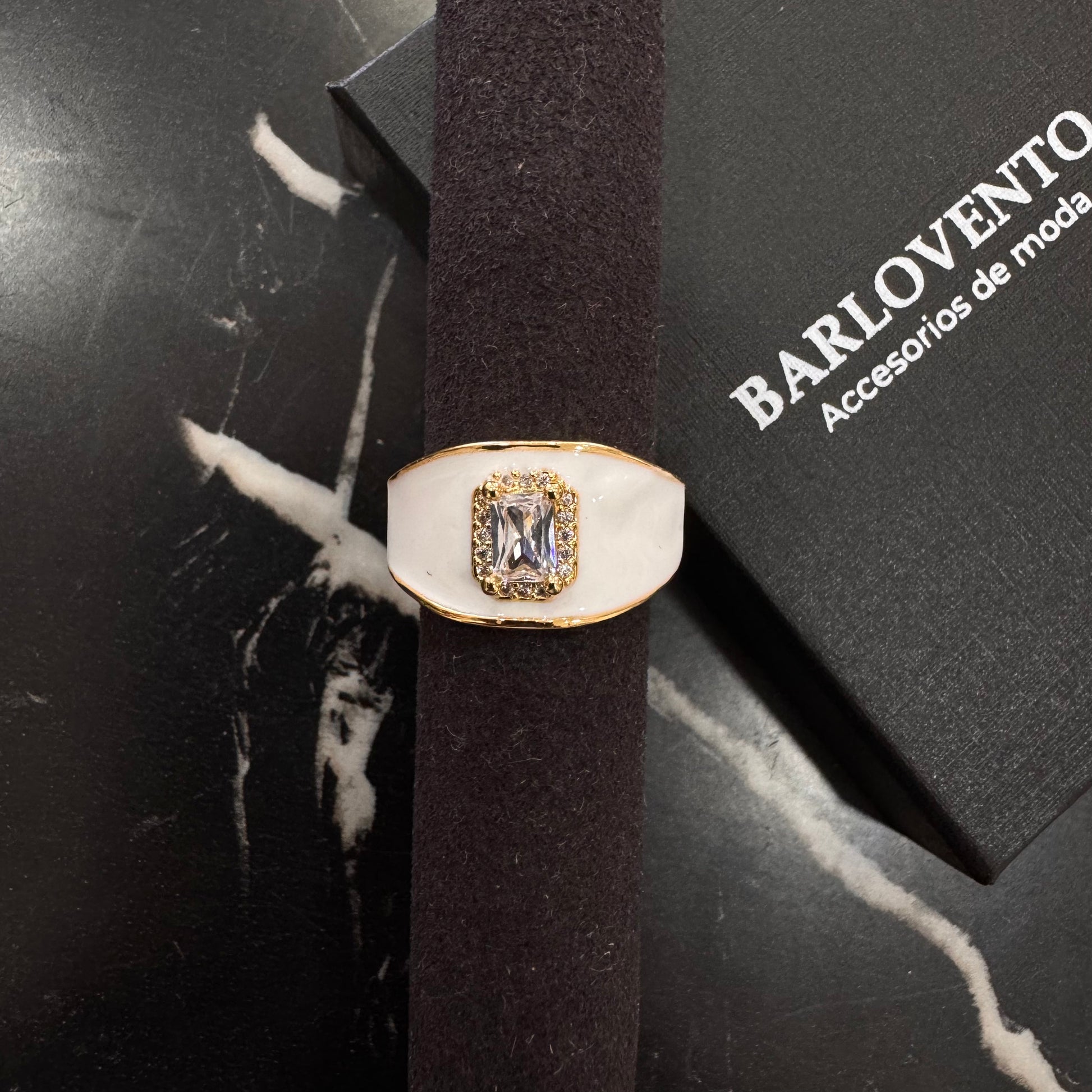 Hermosos anillos ajustables, con diseño en oro laminado y esmaltado color blanco