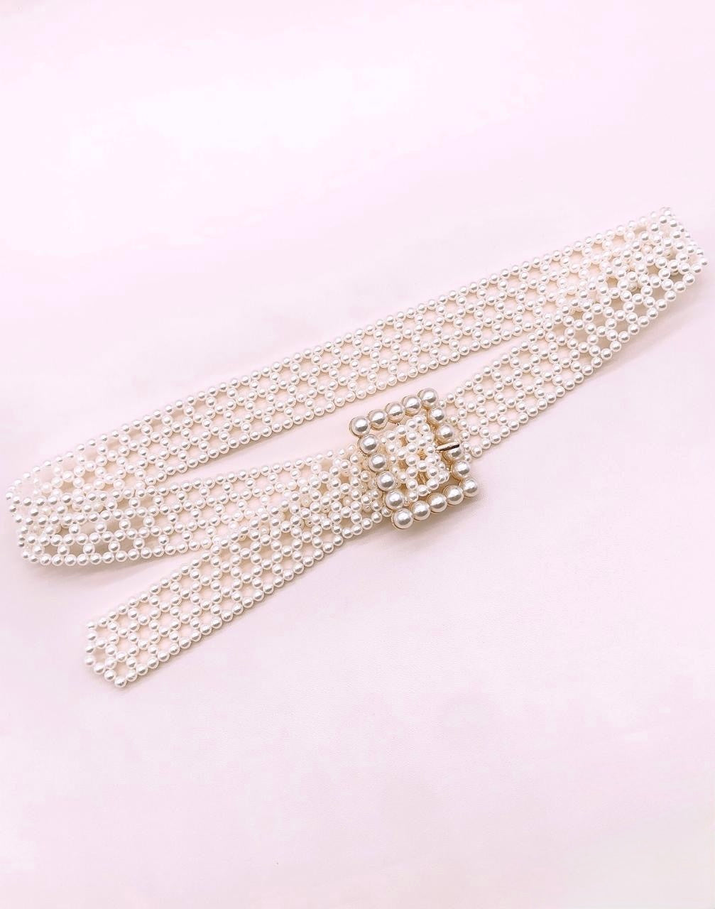 Hermoso cinturón de perlas con hebilla en forma rectangular. Unitalla