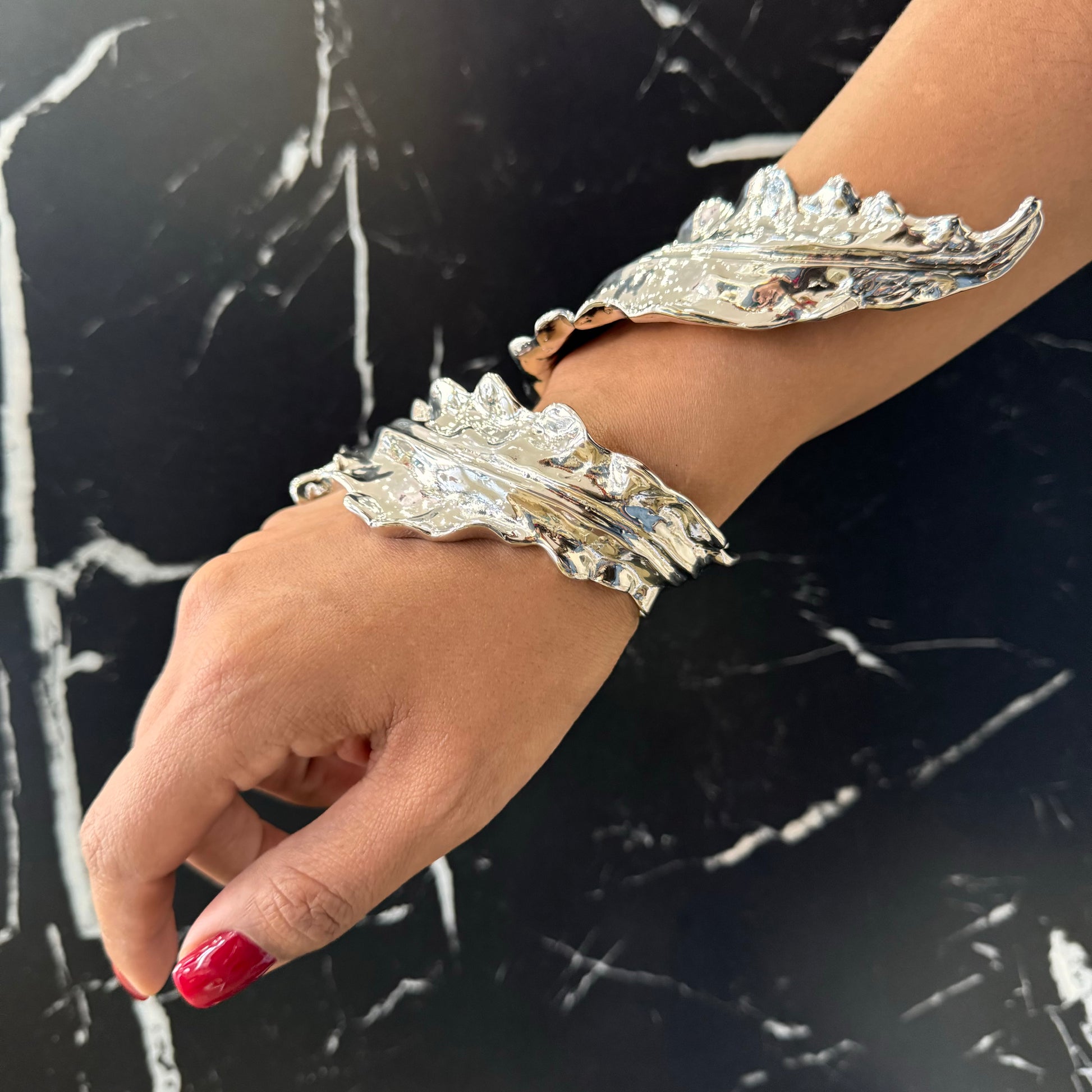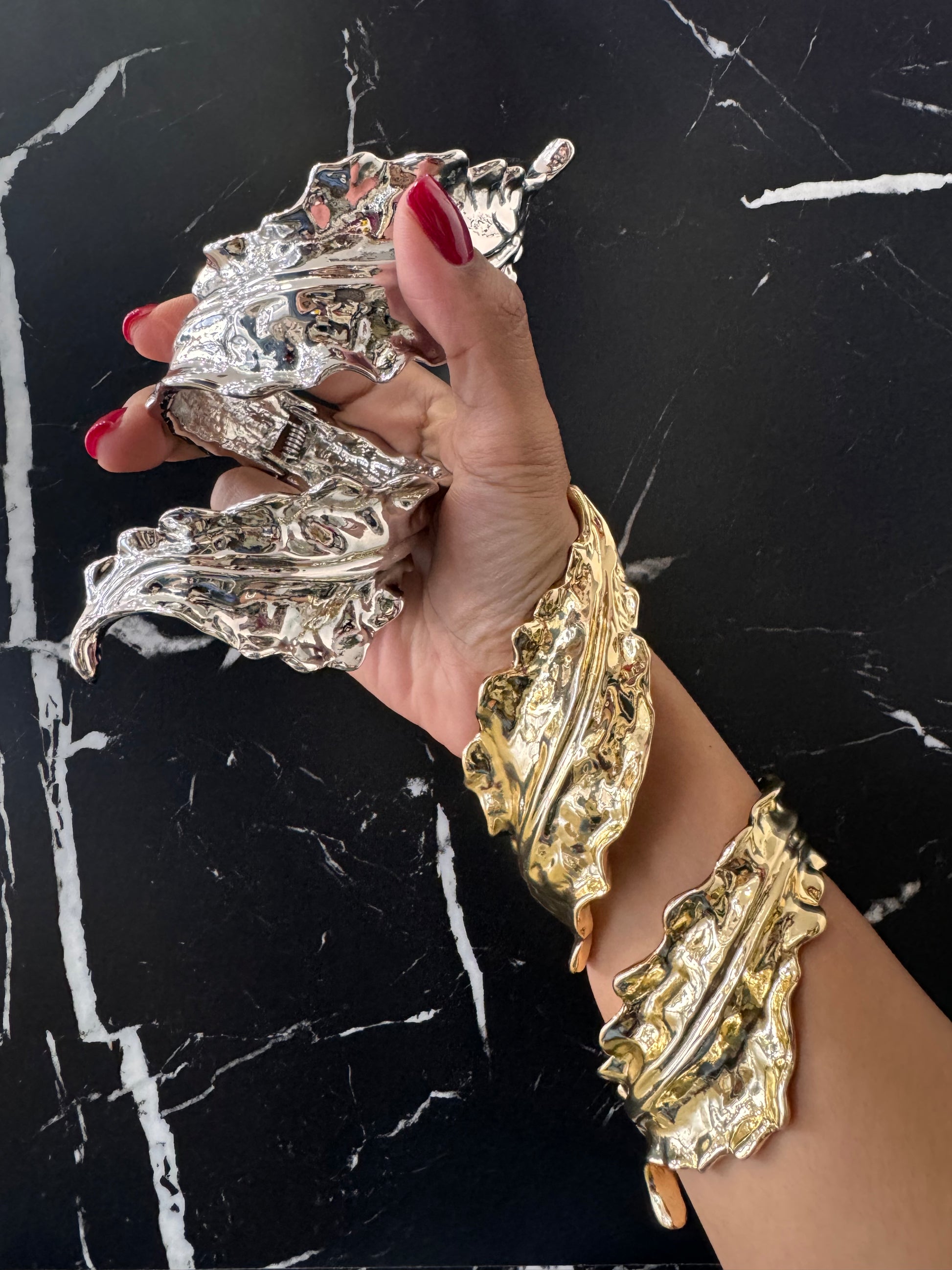 Pulsera y brazalete de diseño único en dorado y plateado, con formas orgánicas y texturas onduladas. Elegantes y llamativos, ideales para complementar cualquier look sofisticado.