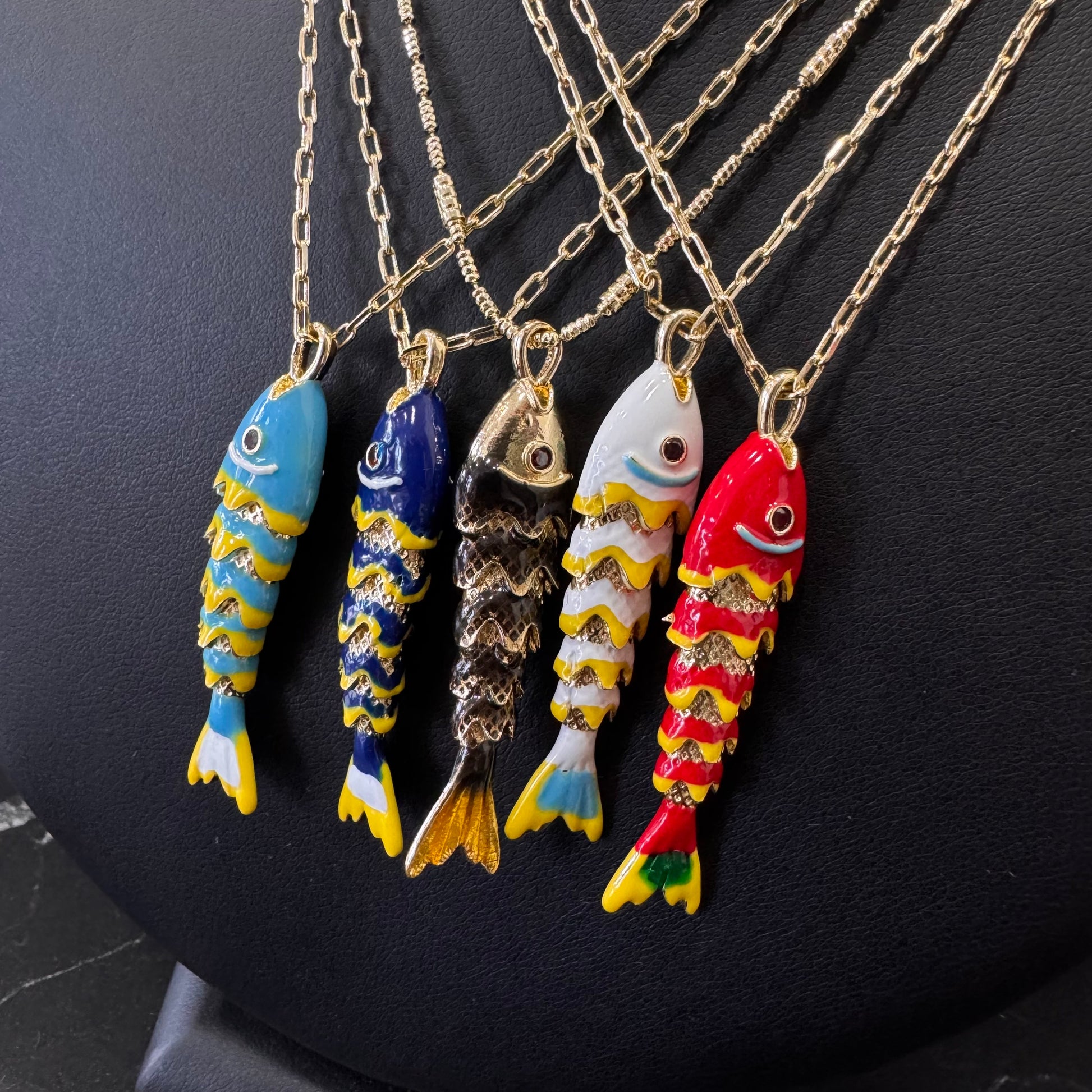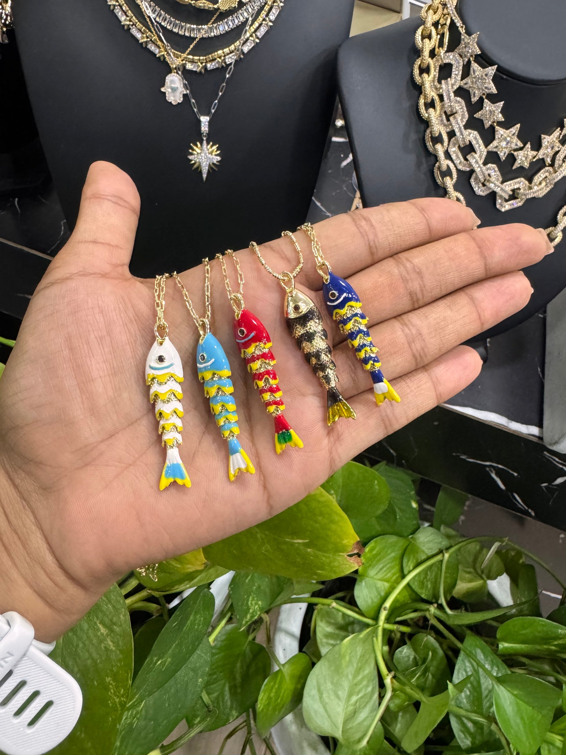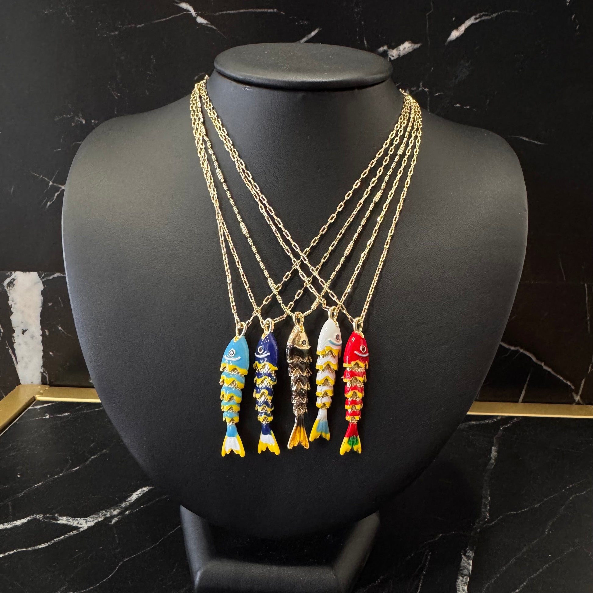 Este elegante collar con dije de pez de la suerte es un amuleto de la buena fortuna en una variedad de colores. Una pieza única inspirada en la naturaleza, perfecta para complementar tu atuendo y atraer éxito y prosperidad. Hecho con materiales de alta calidad y diseño exclusivo para un estilo sofisticado.
