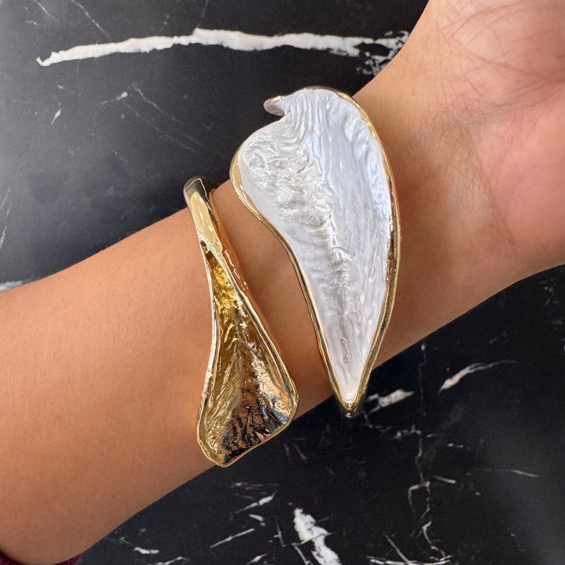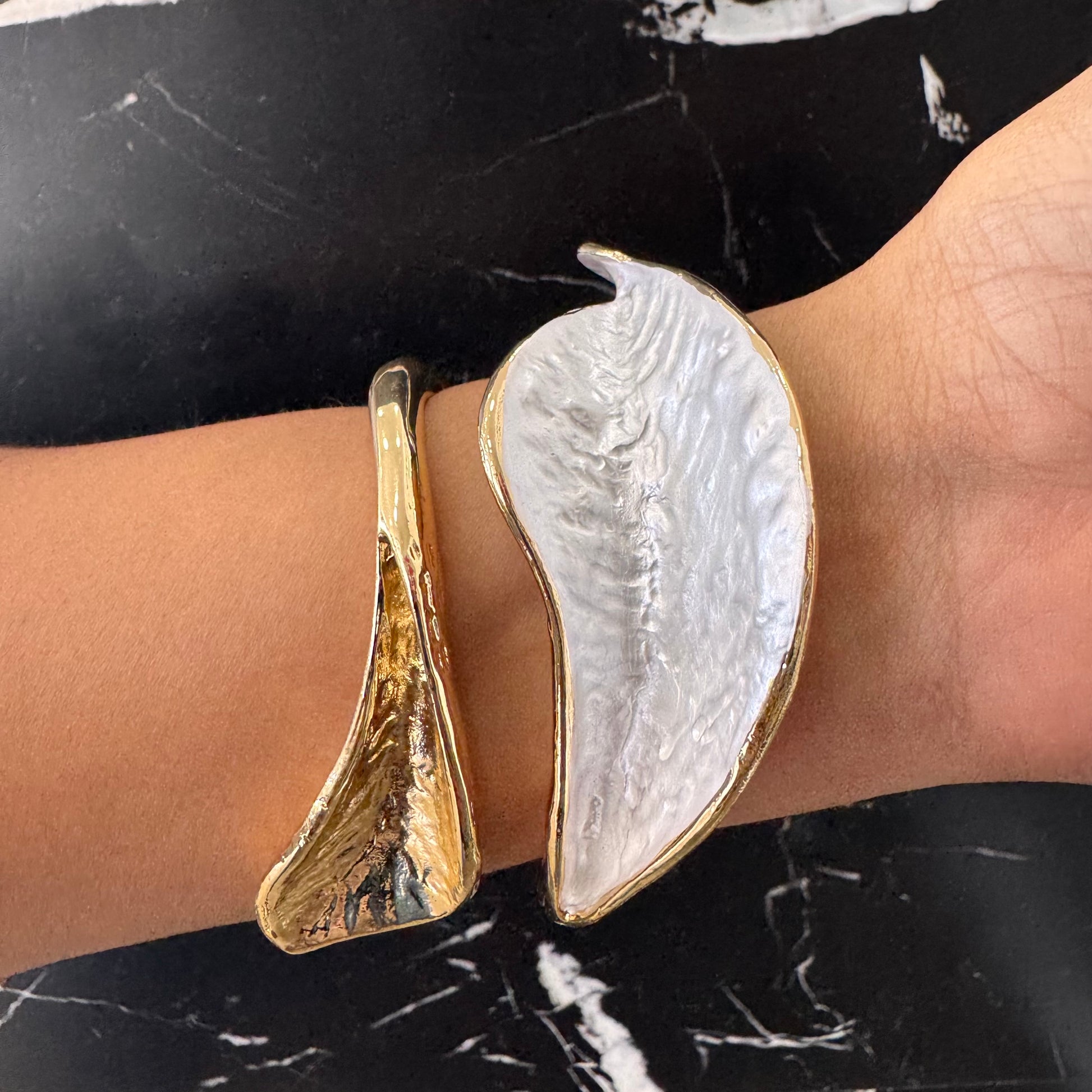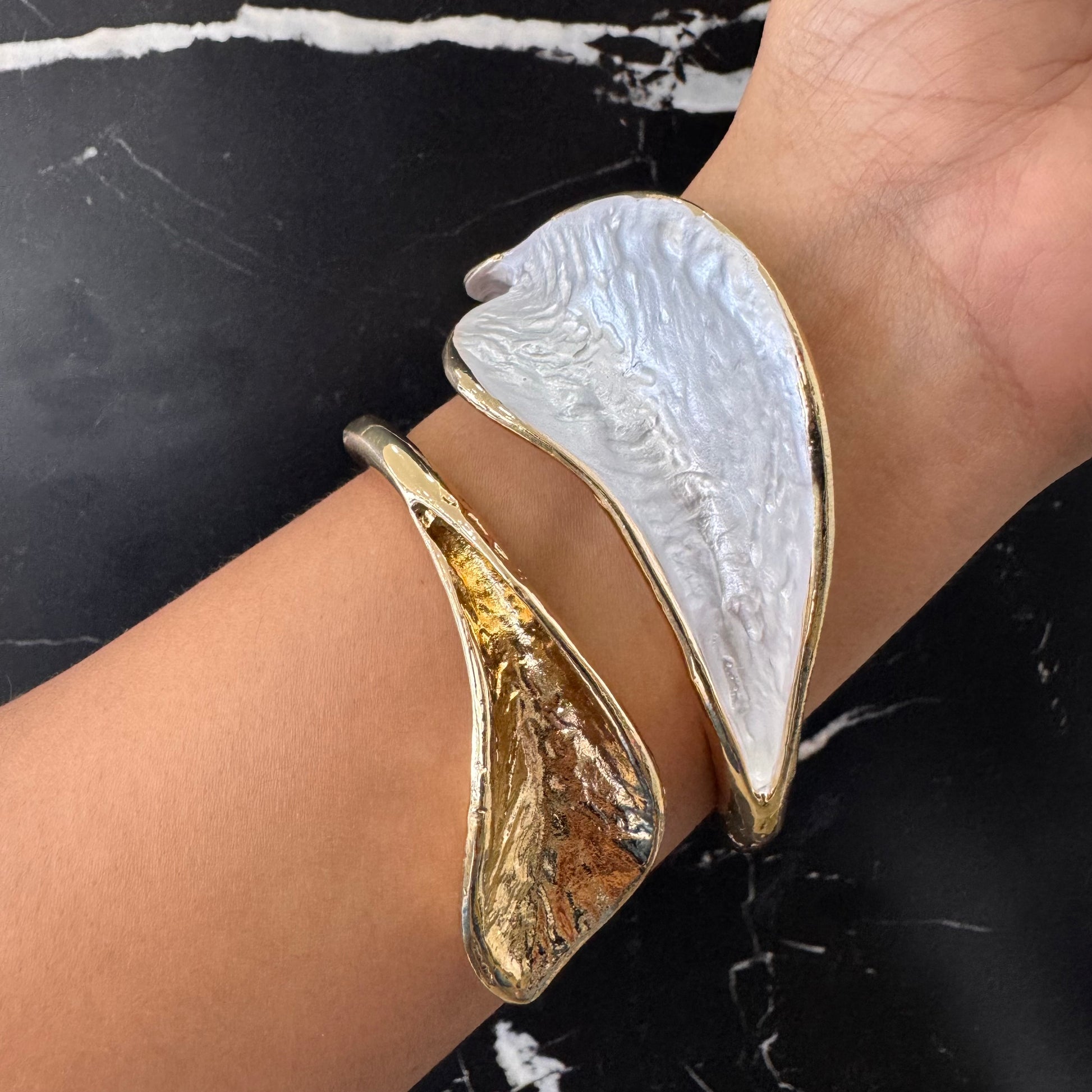 Pulsera aro rígido en oro laminado con diseño combinado dorado con blanco