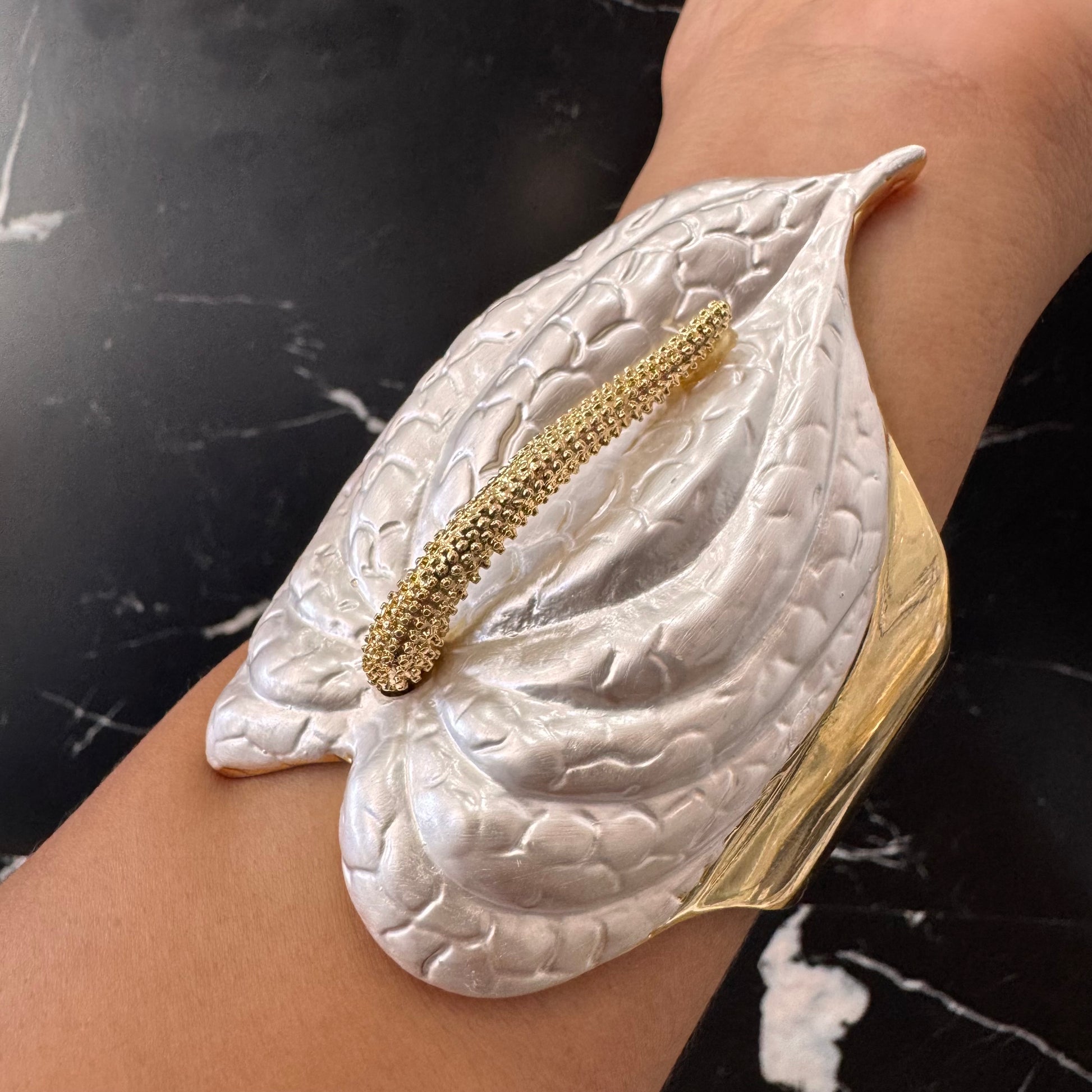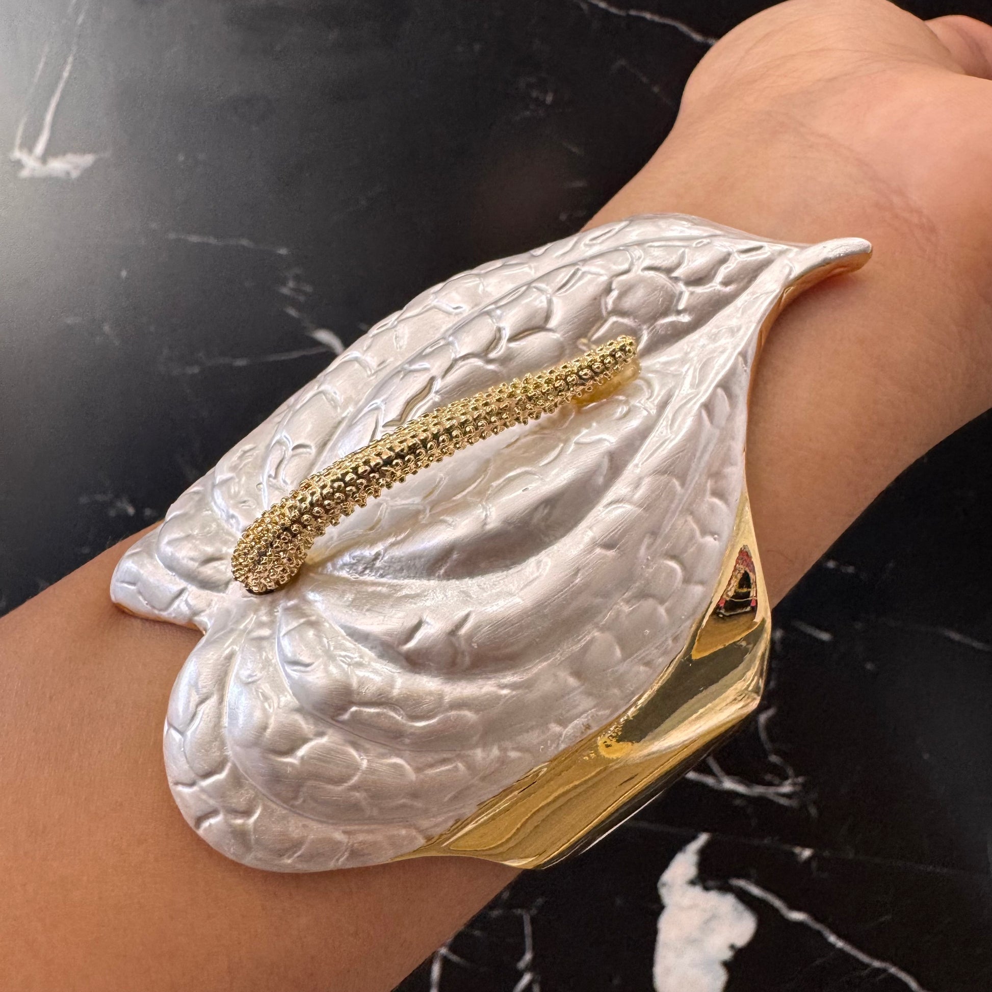 Hermosa pulsera en aro rígido con diseño de flor en oro laminado