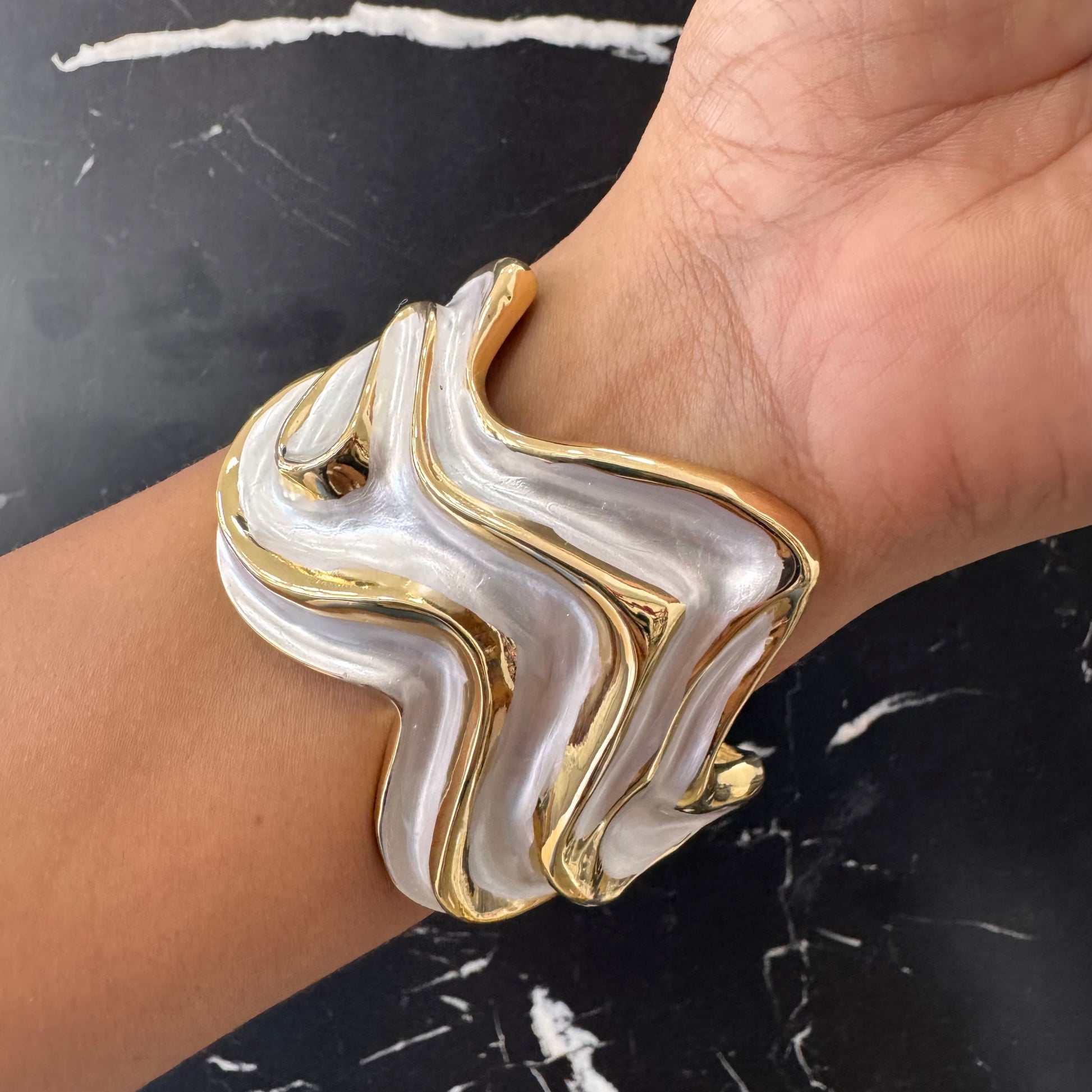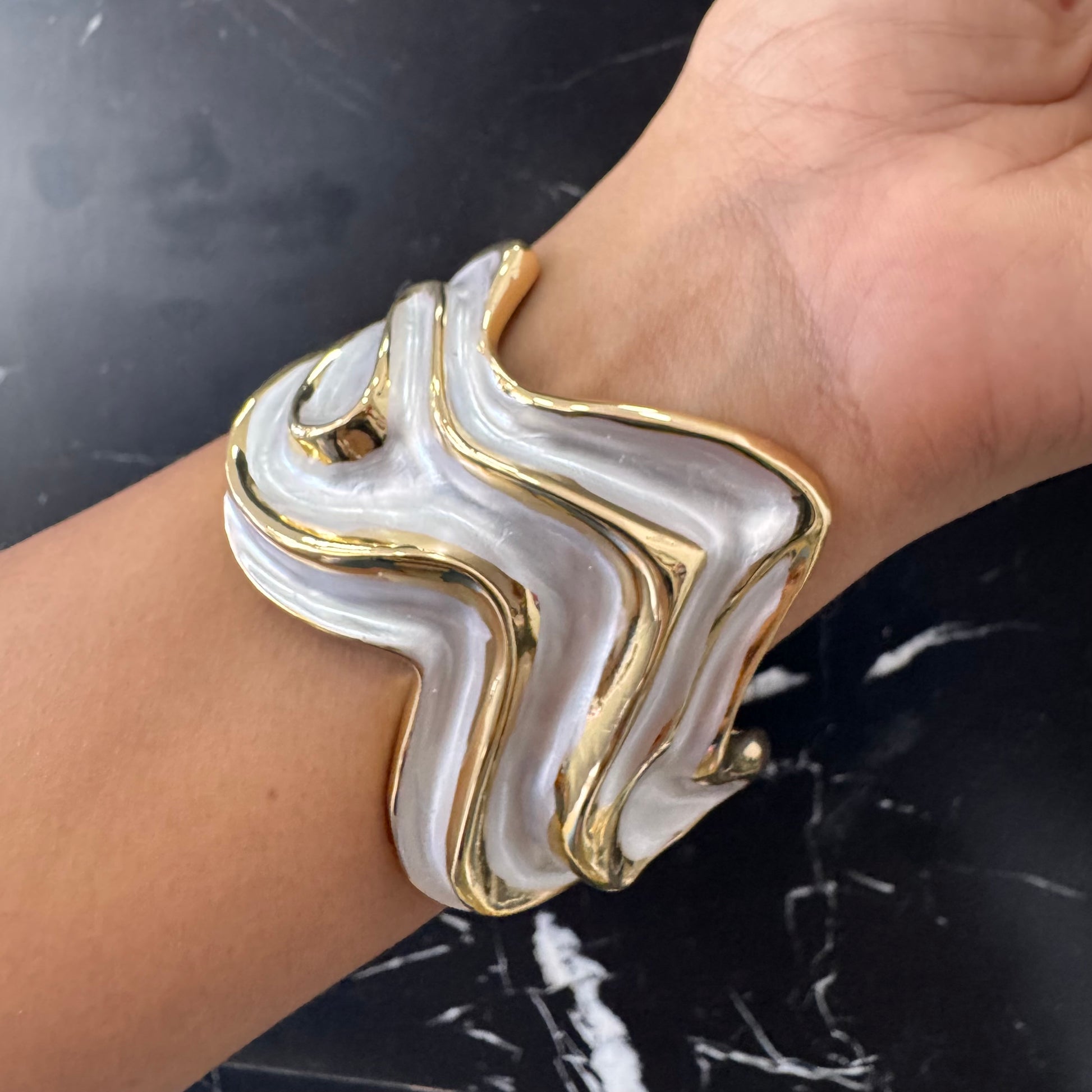 pulsera en aro rígido con diseño en dorado con blanco aperlado