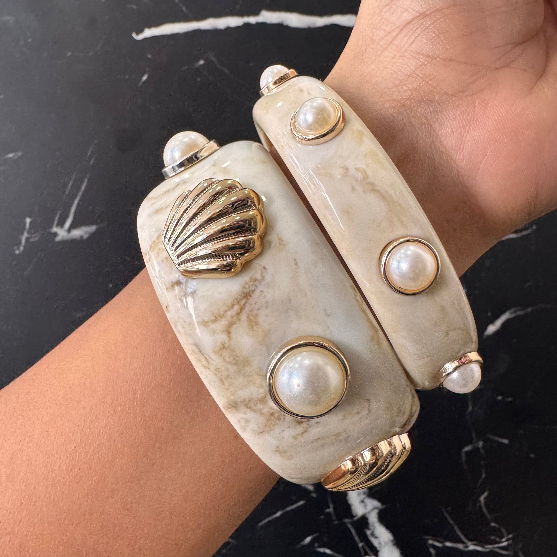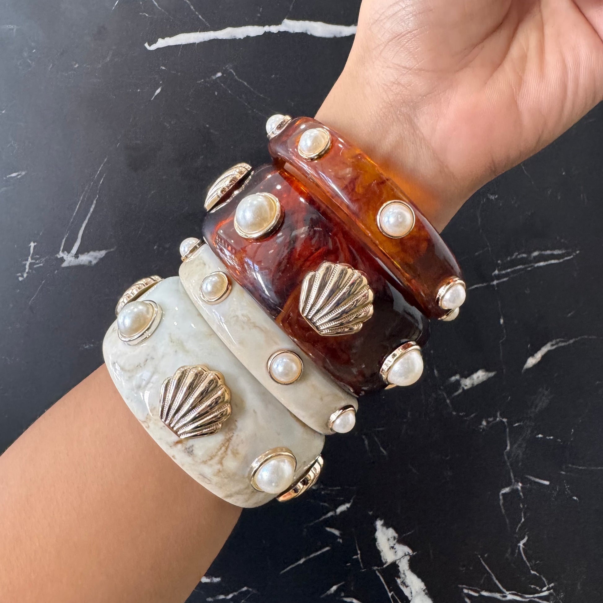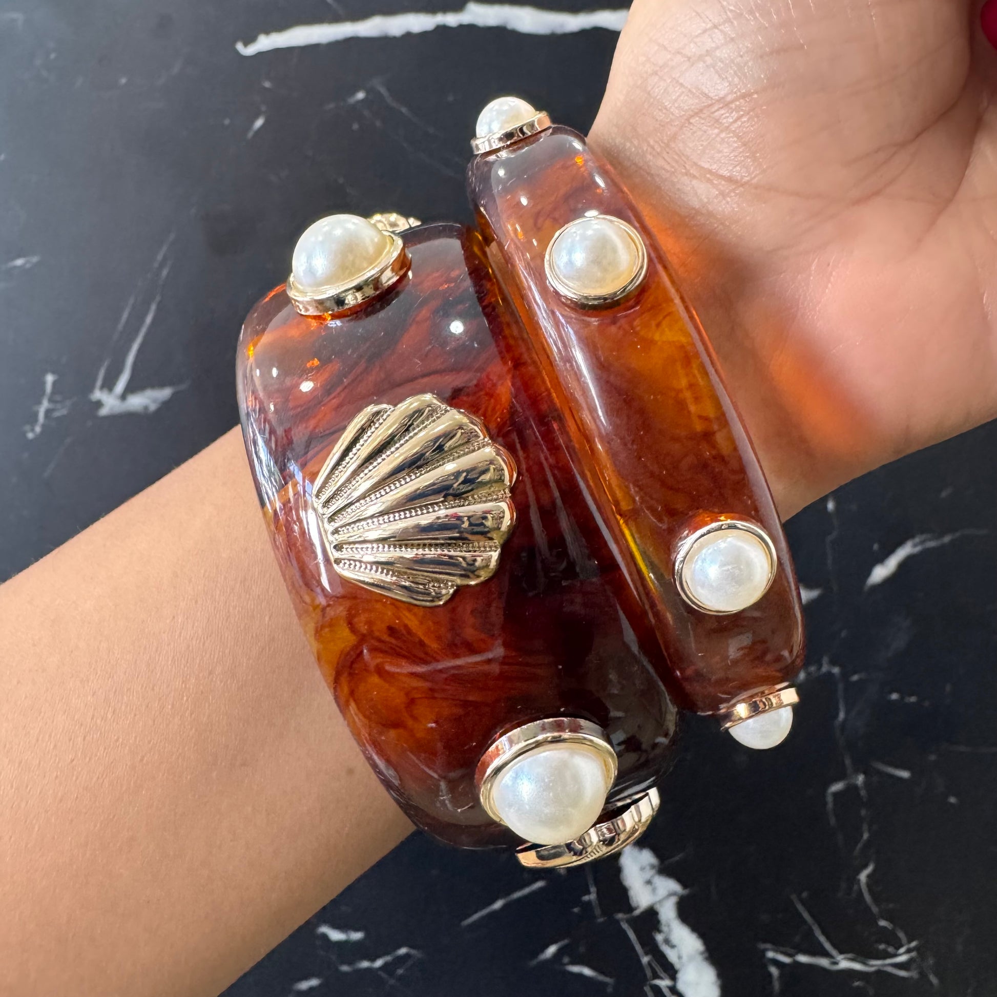 SET DE DOS PULSERAS DE ARO RÍGIDO ACRILICO CON PERLAS Y DIJE DE CONCHA