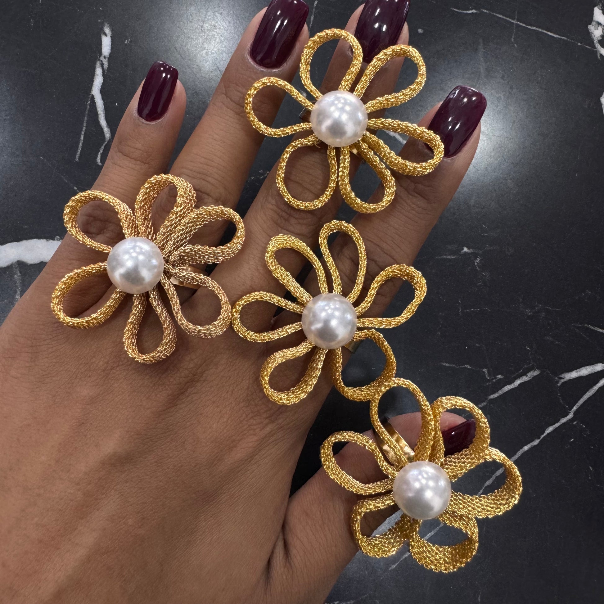 Anillo ajustable con diseño de flor dorada con detalle de perla