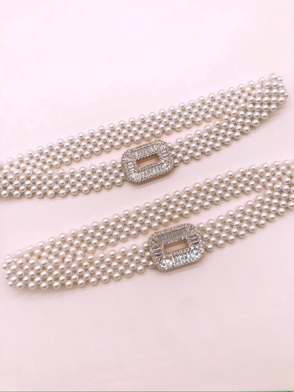 Hermoso cinturón de perlas elástico con hebilla rectangular con cristales. Unitalla.